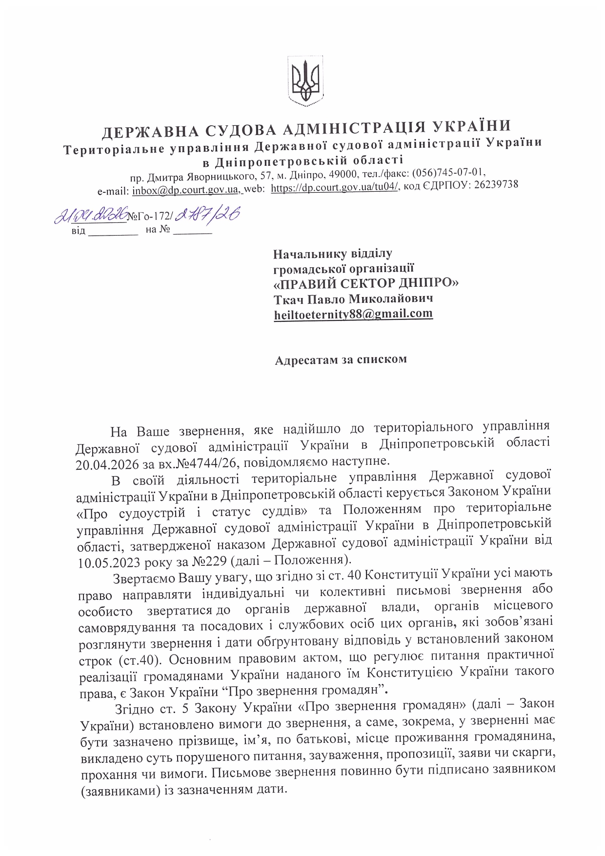 Територіальне управління Державної судової адміністрації України в Днiпропетровській областi